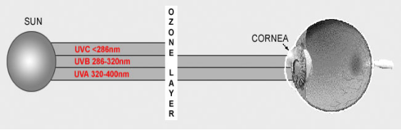 · UVB (286-320nm) is that solar energy which is the cause of sunburn and snow blindness and is absorbed by the cornea.