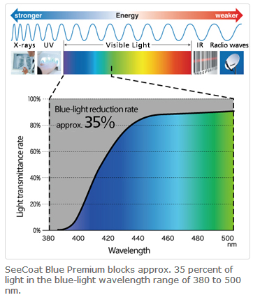 SeeCoat Blue was developed in 2011, as the first lens coating technology in the world that effectively reduces incoming blue light to the eyes. Blue-light reduction can be attempted by tinting lenses in yellow, which absorbs blue light. But some consumers may shun wearing yellow lenses. Instead, SeeCoat Blue adopted AR coating technology. Taking advantage of the principles of AR coating in the opposite way, SeeCoat Blue prevents blue light from passing through the lens by increasing the reflection of blue light.