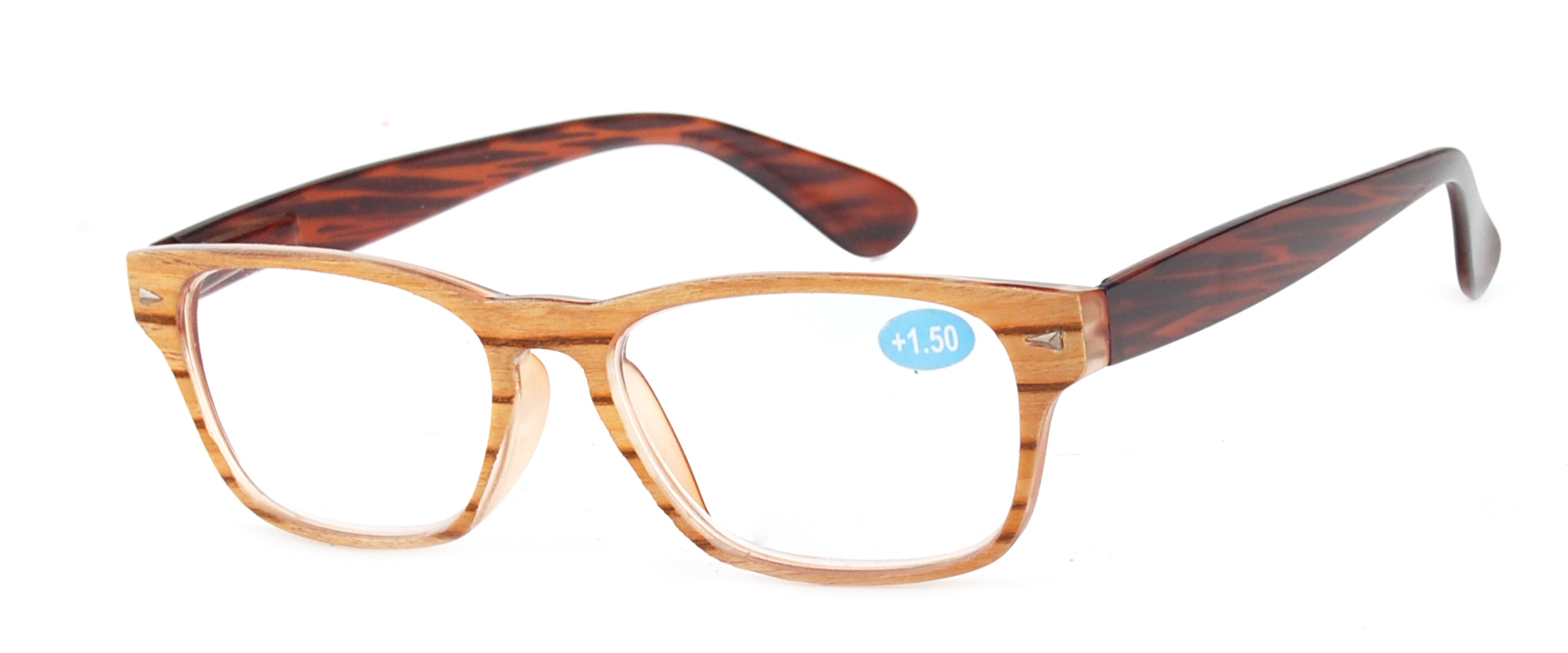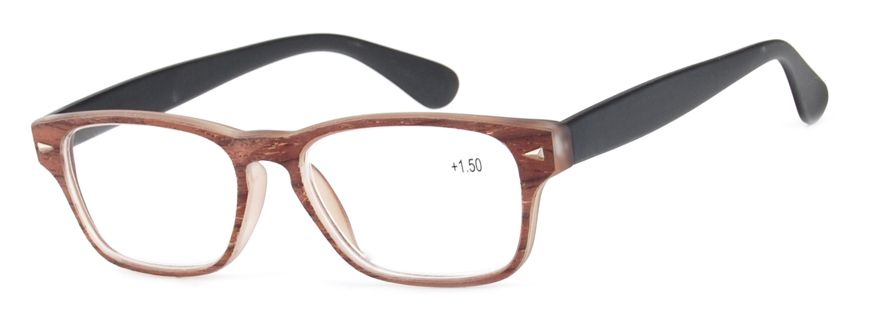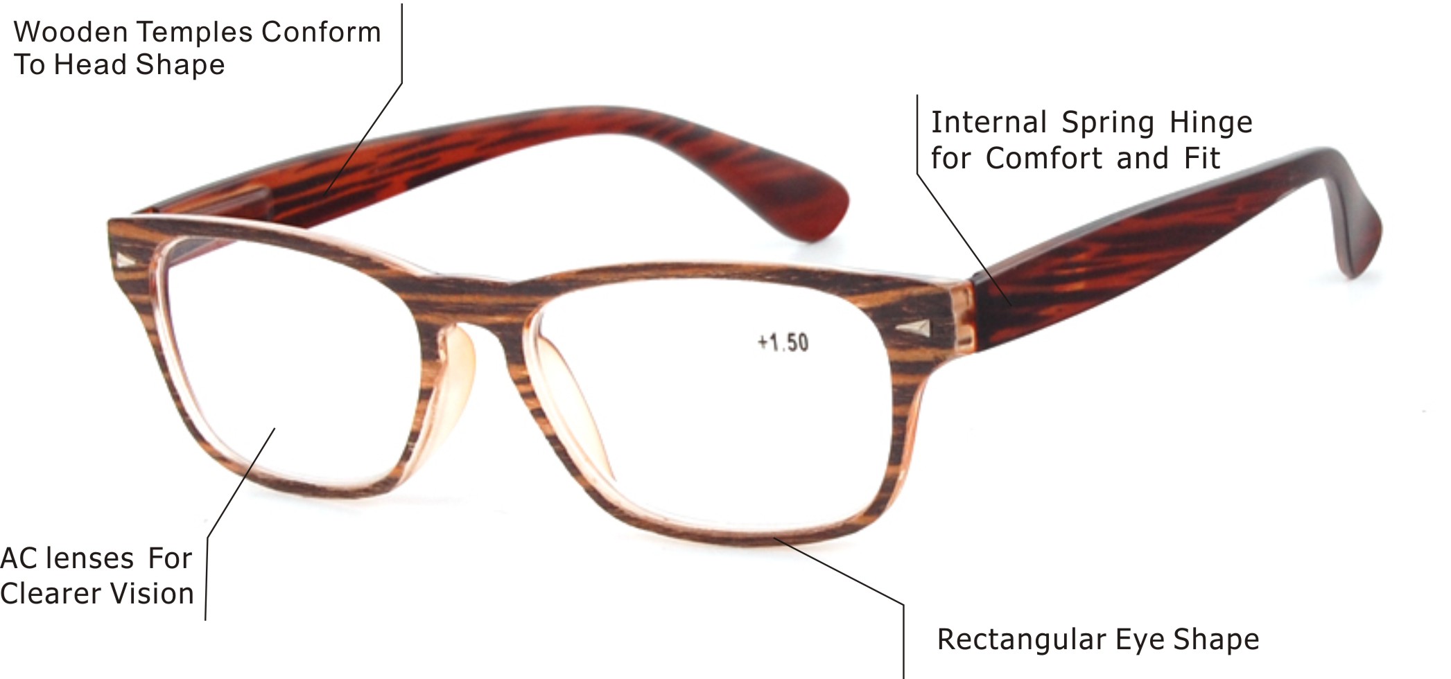 Modern full-frame style, internal spring hinge and shiny clear with wood stick and temple in wood pattern.