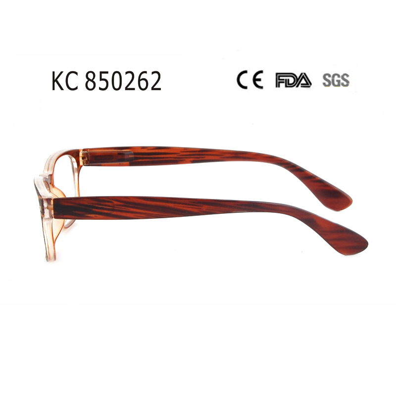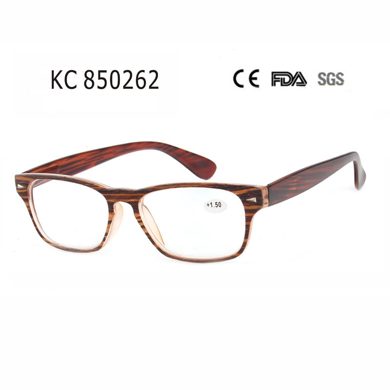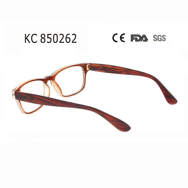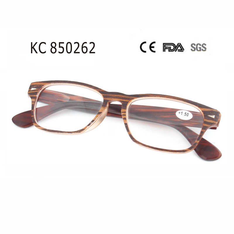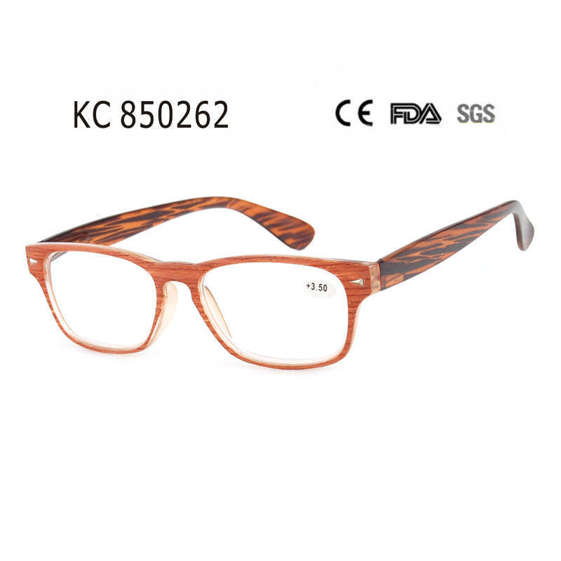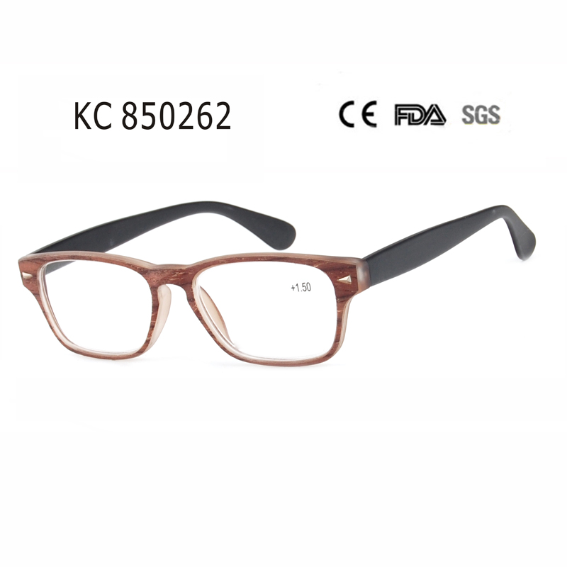 Modern full-frame style, internal spring hinge and shiny clear with wood stick and temple in wood pattern.