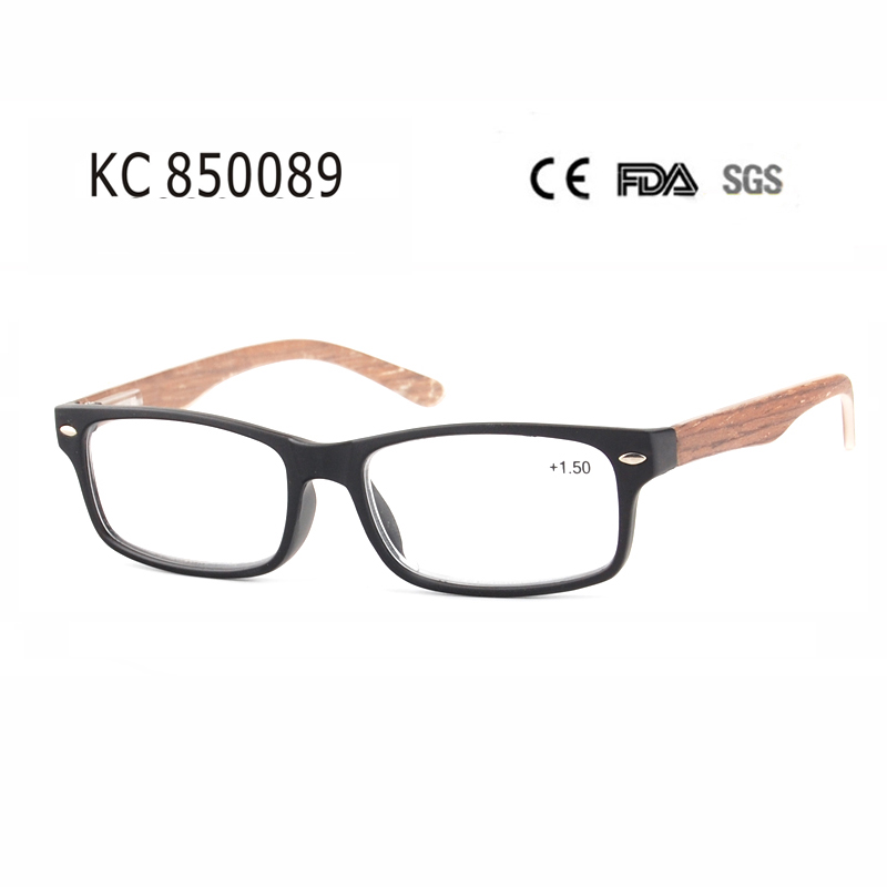 Modern full-frame style, internal spring hinge and shiny clear with wood stick and temple in wood pattern.