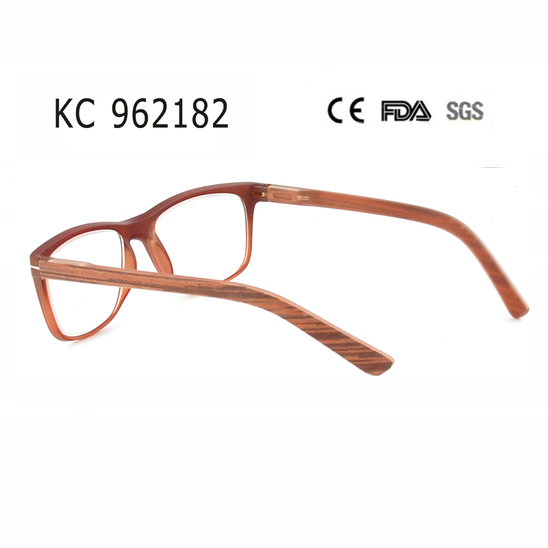 Modern full-frame style, internal spring hinge and matte brown and temple in wood pattern.