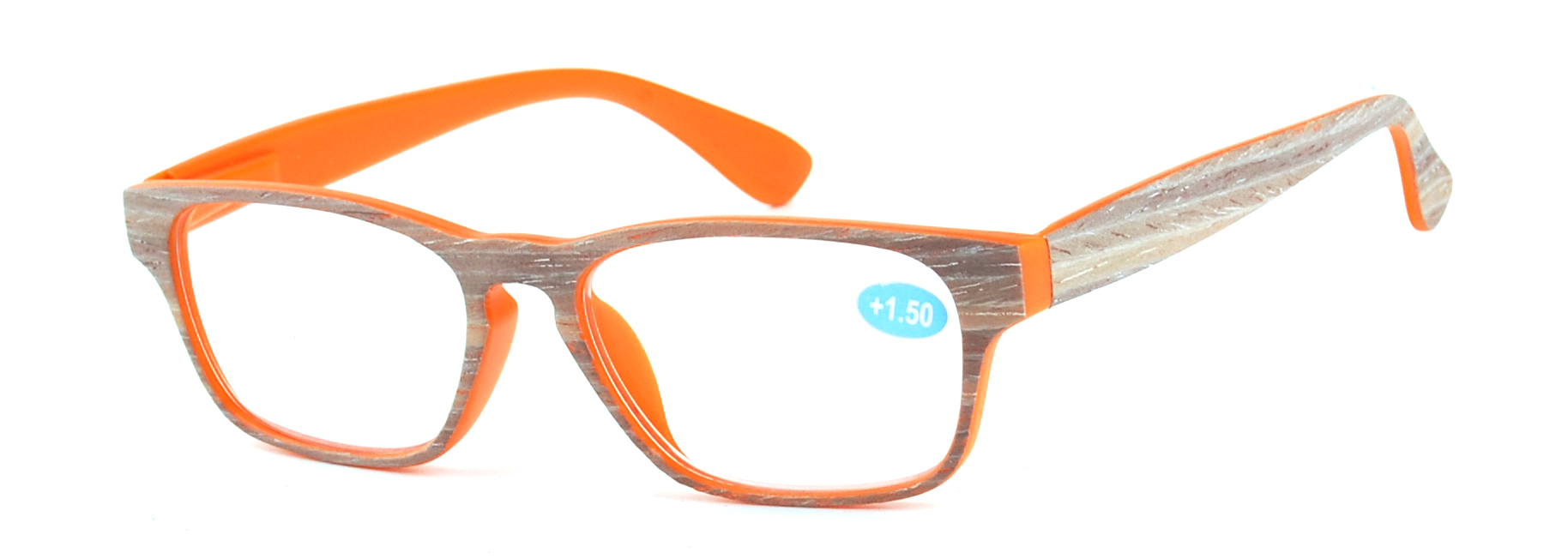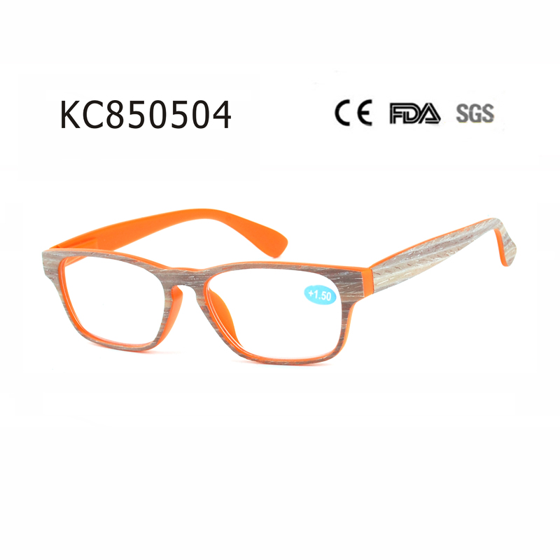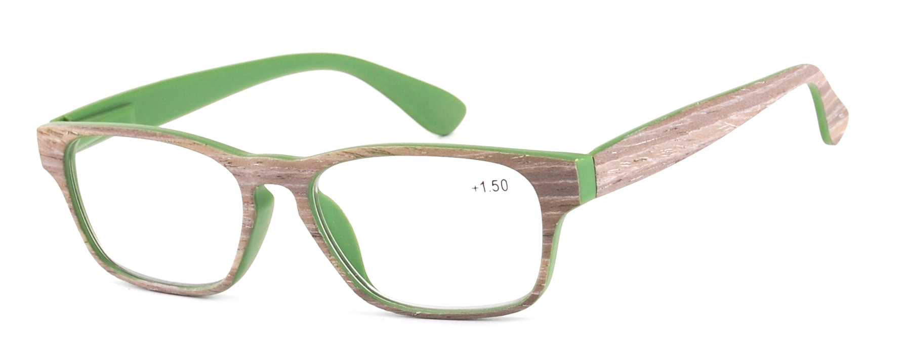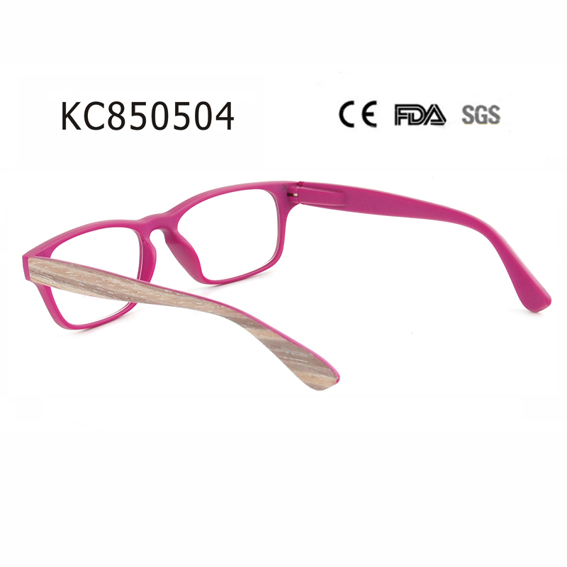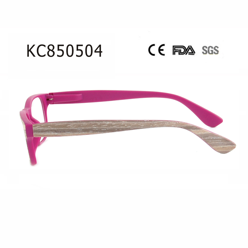 Modern full-frame style, internal spring hinge and matte clear with wood stick and temple in wood pattern.