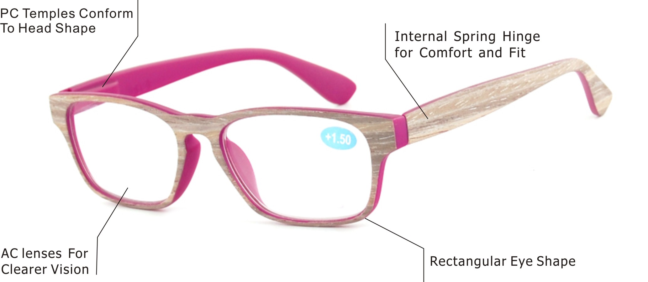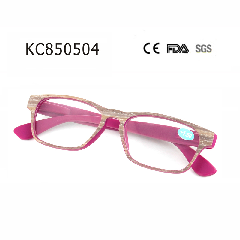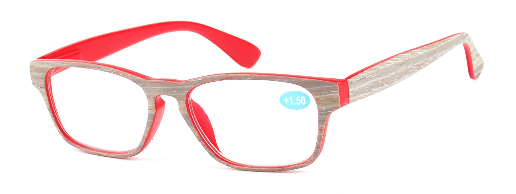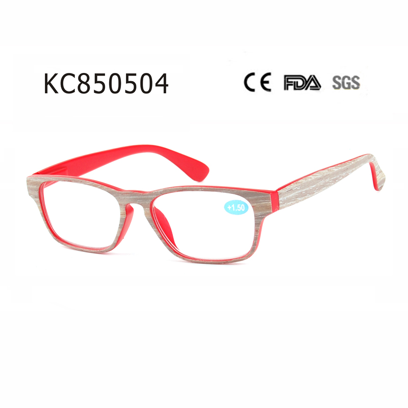 Modern full-frame style, internal spring hinge and matte clear with wood stick and temple in wood pattern.