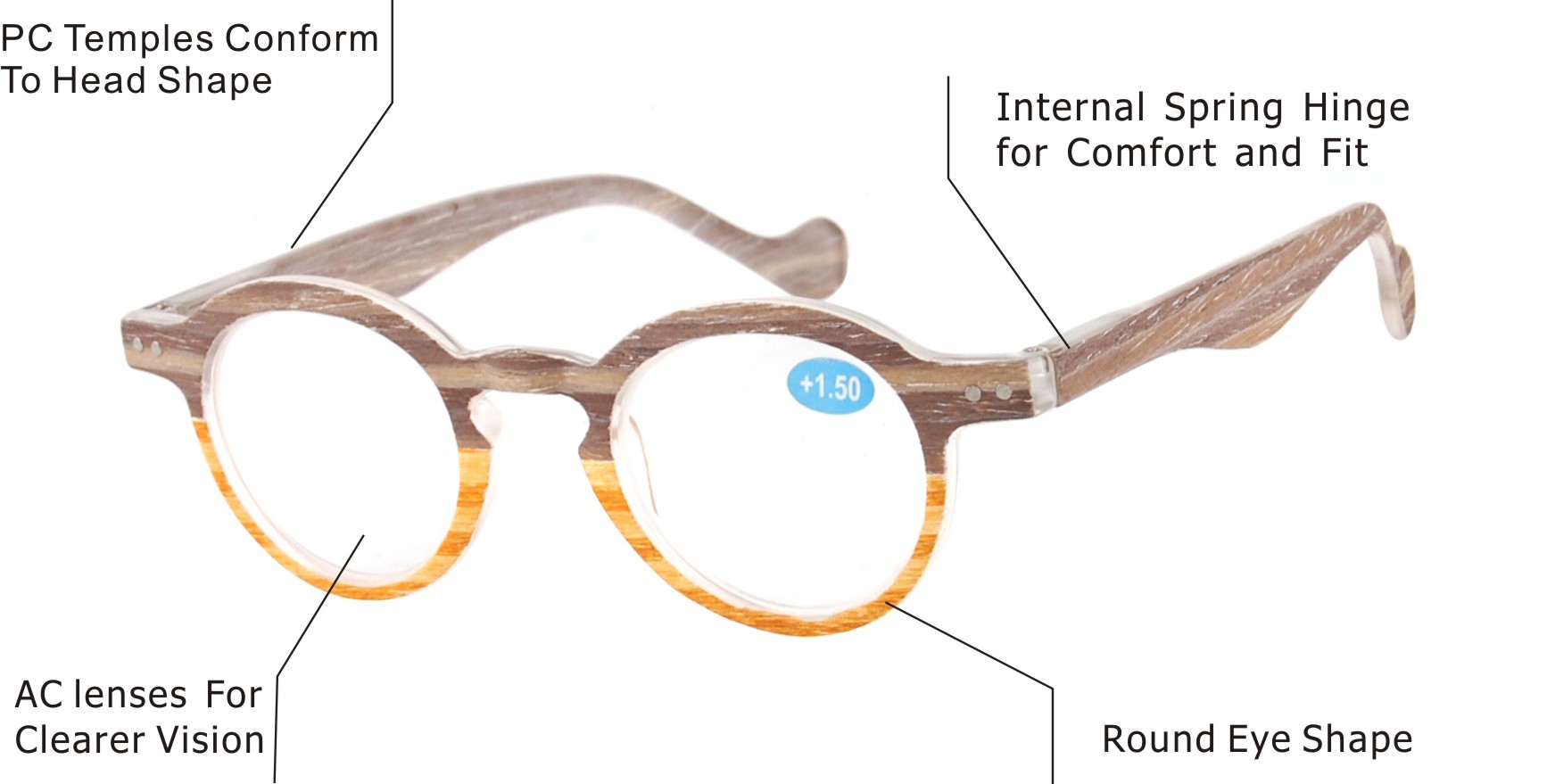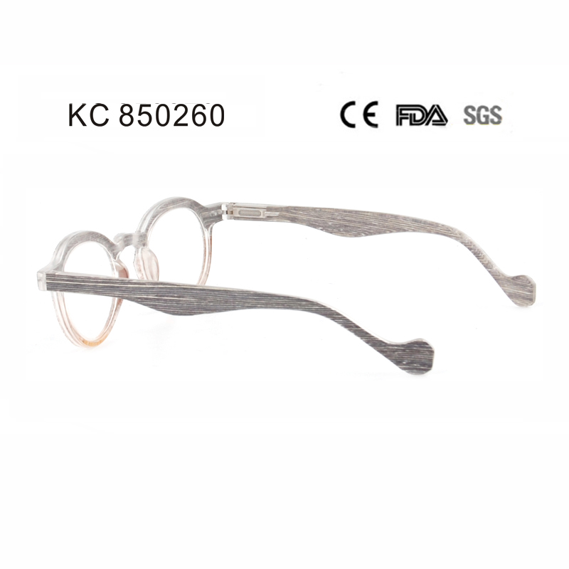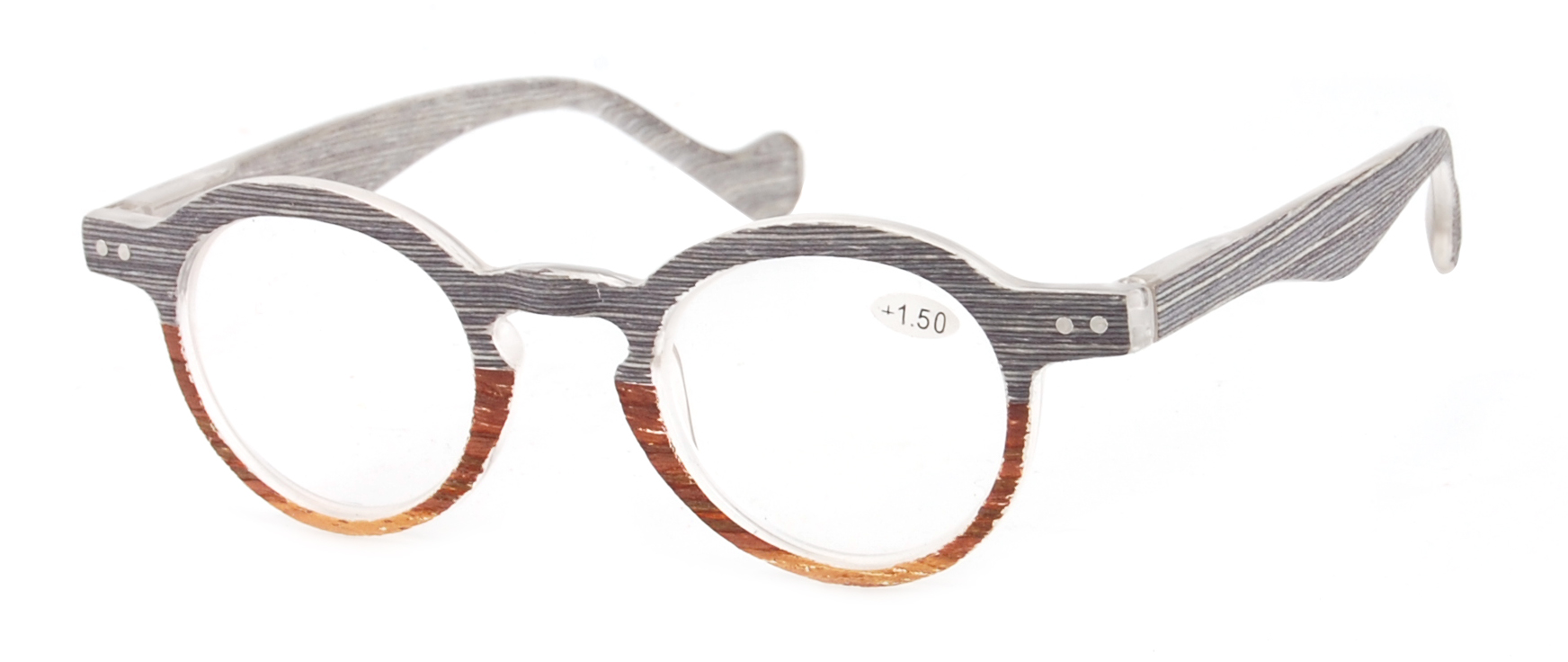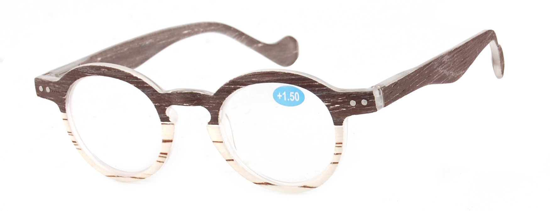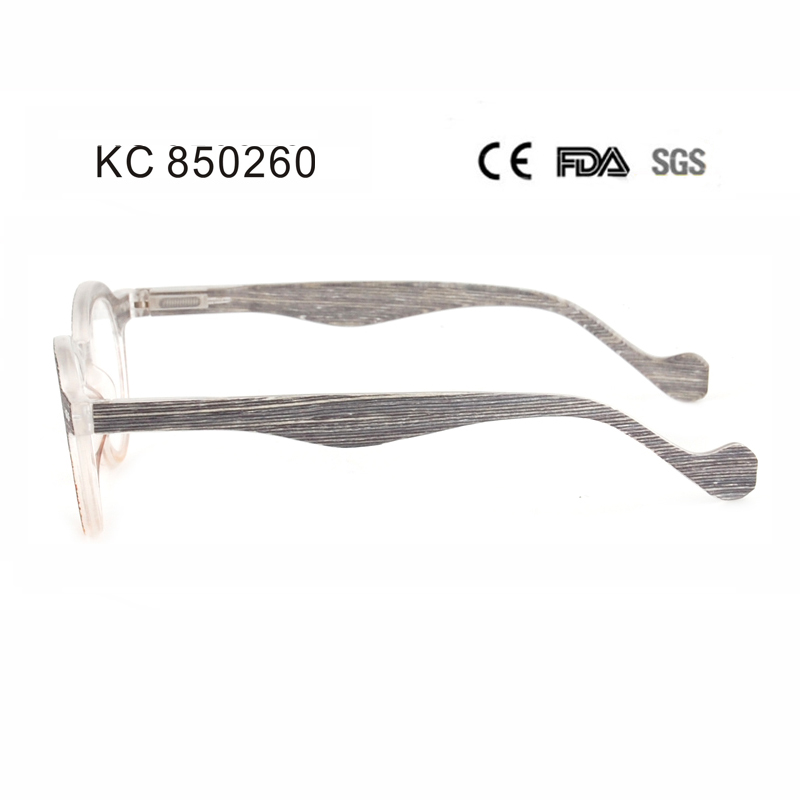 Modern full-frame style, internal spring hinge and matte clear with wood stick and temple in wood pattern.