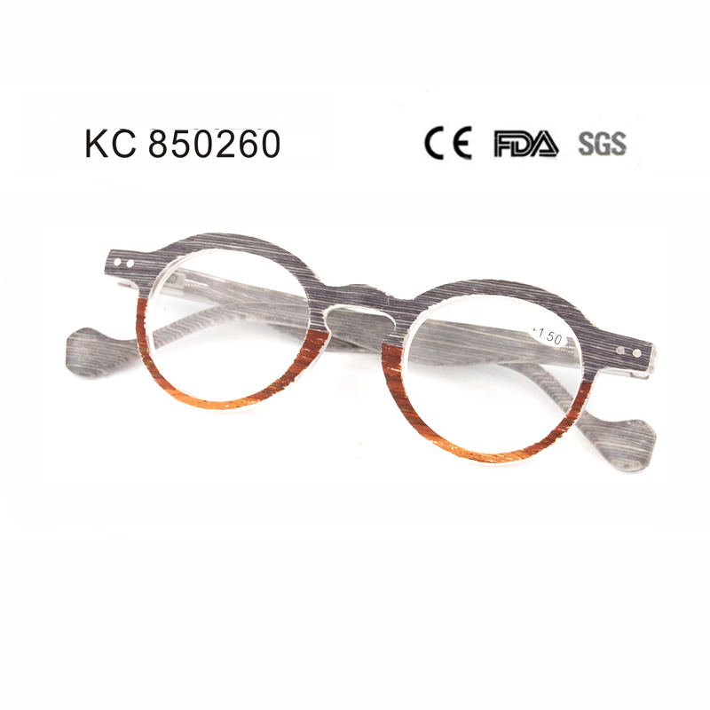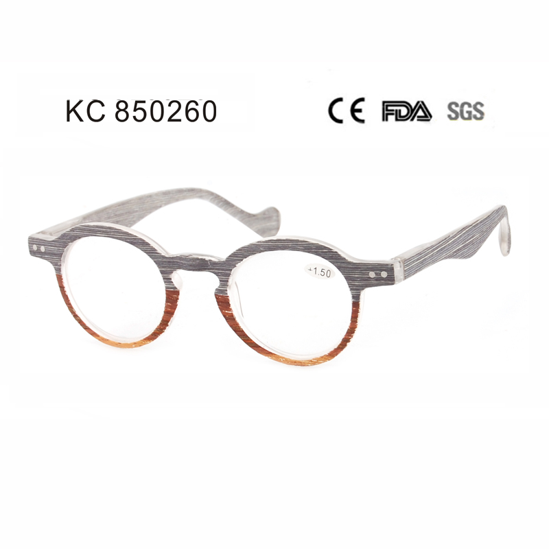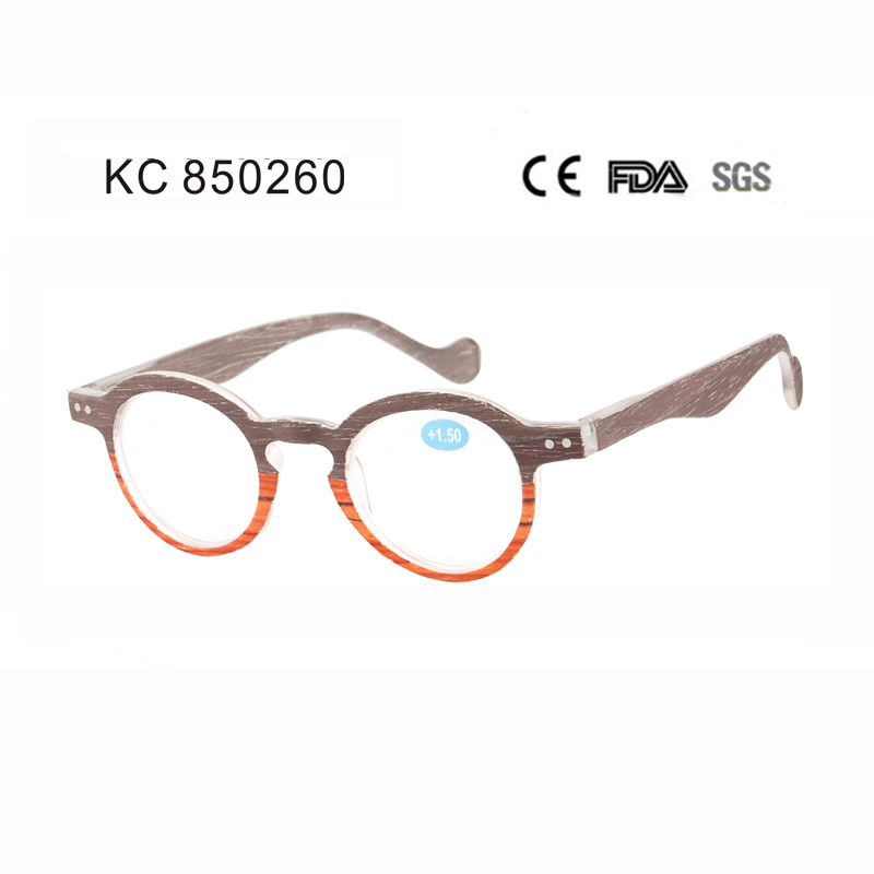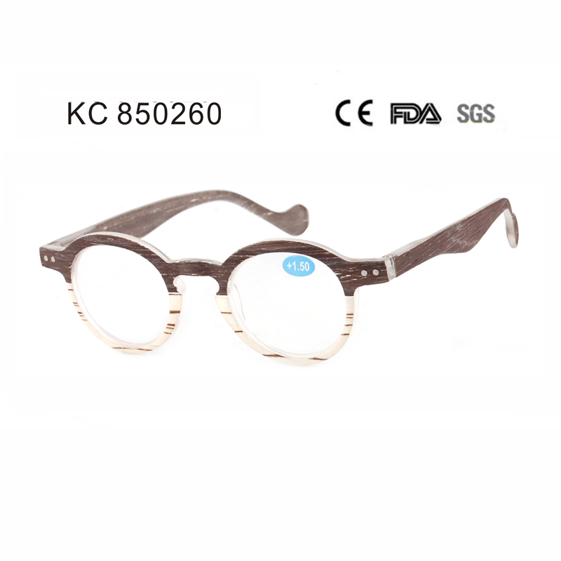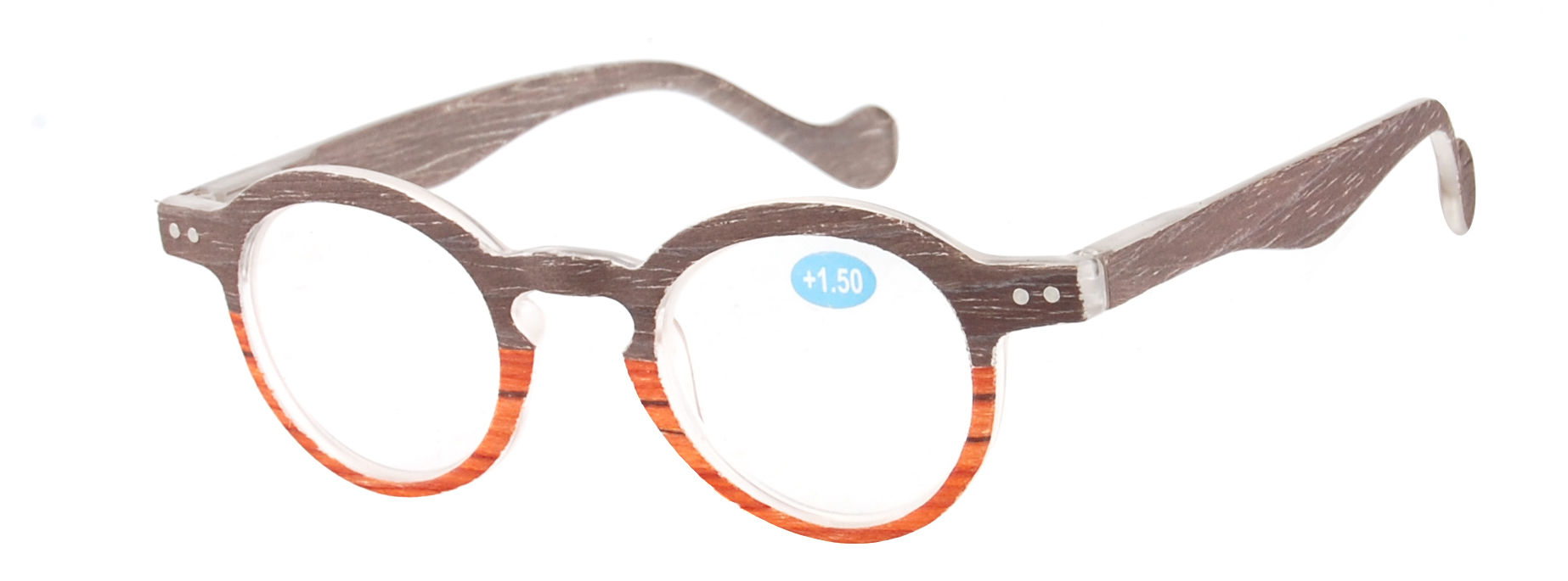 Modern full-frame style, internal spring hinge and matte clear with wood stick and temple in wood pattern.