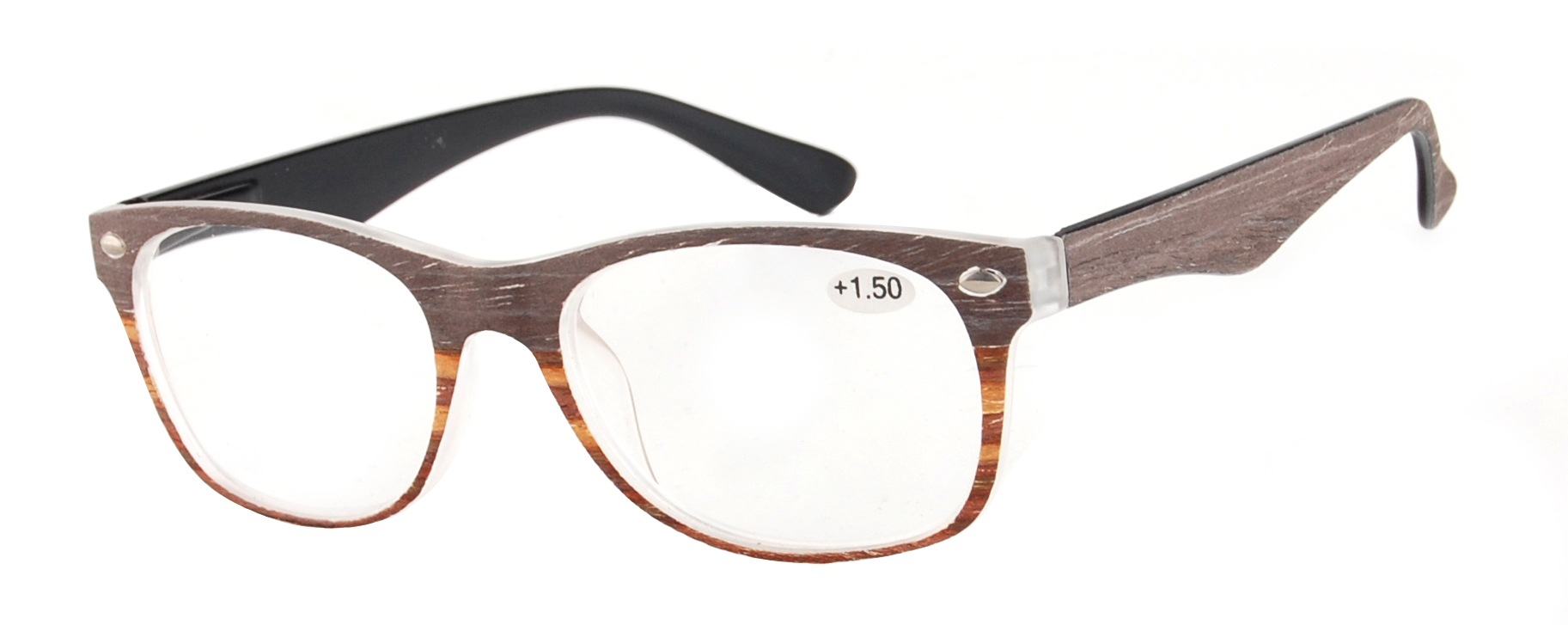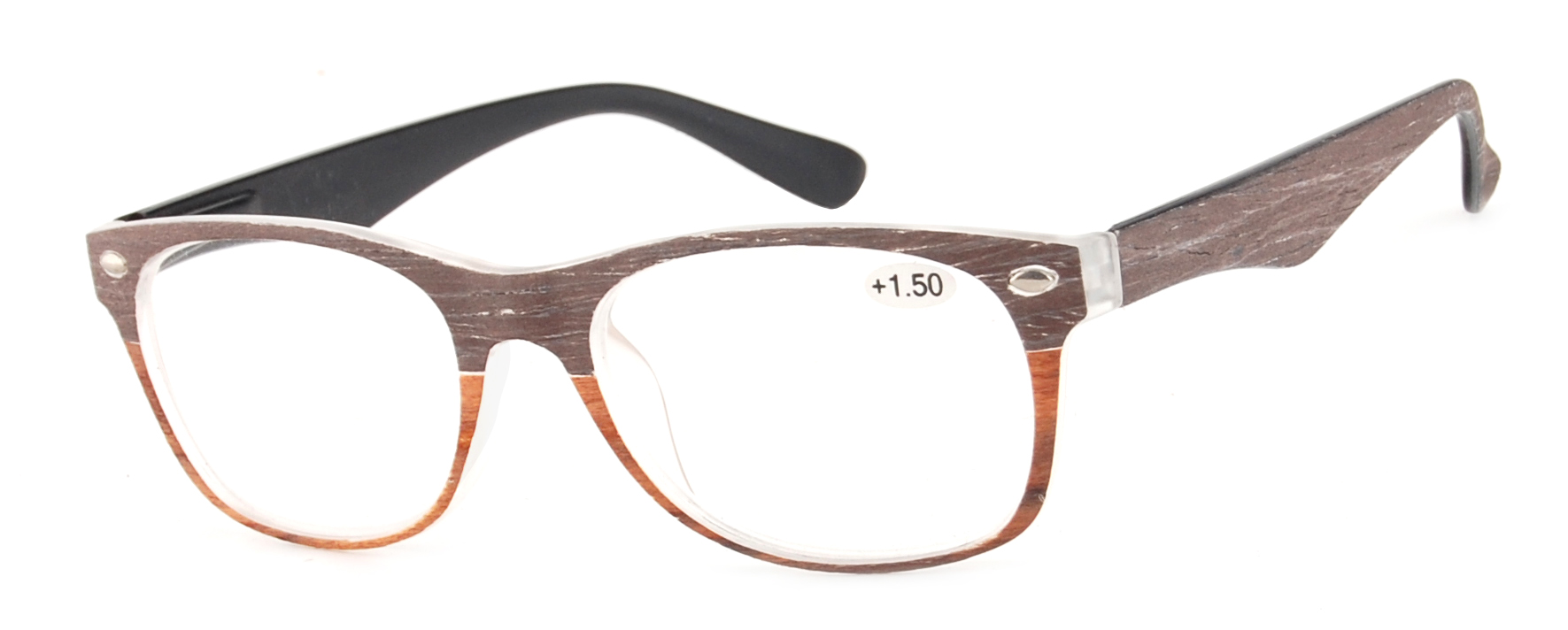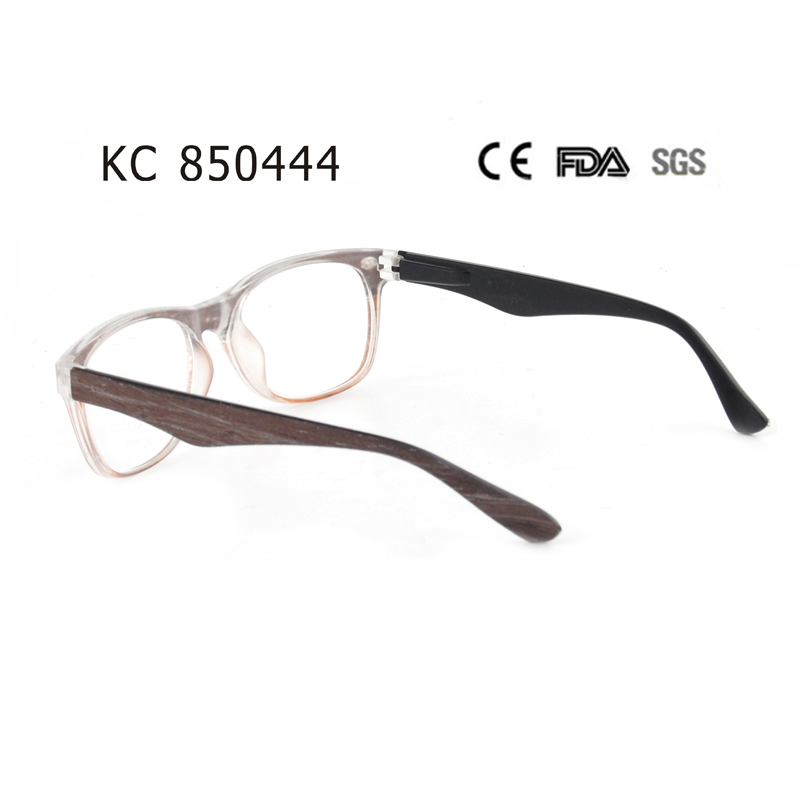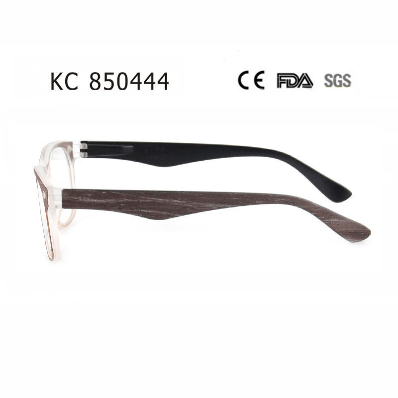 Modern full-frame style, internal spring hinge and matte clear with wood stick and temple in wood pattern.
