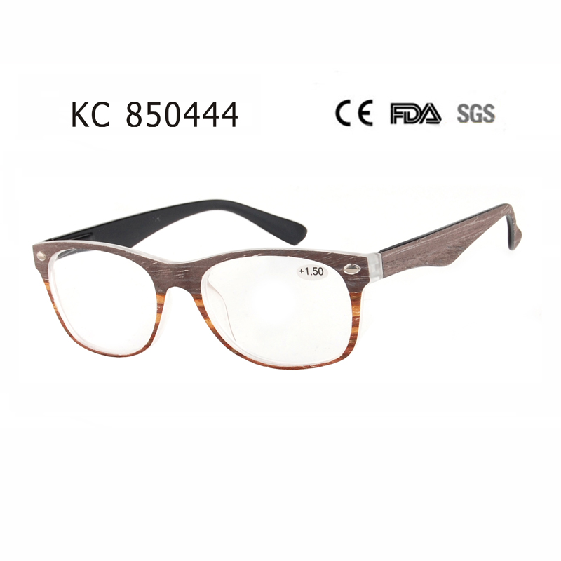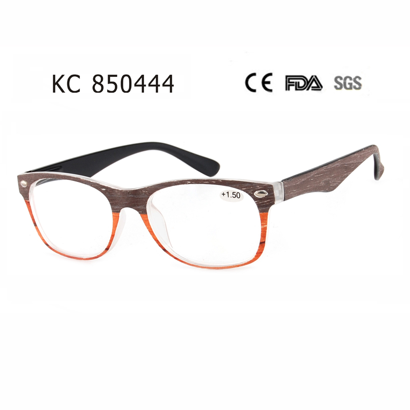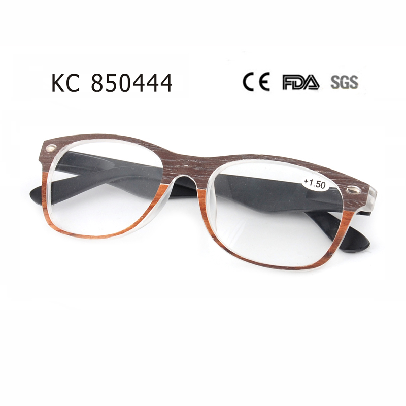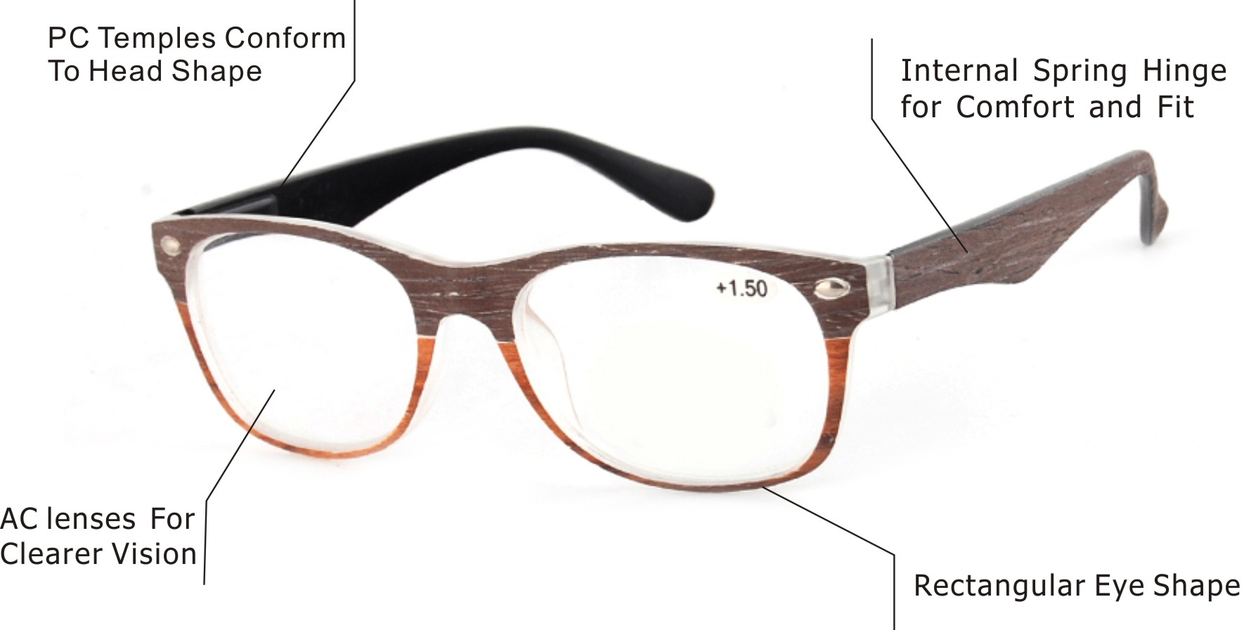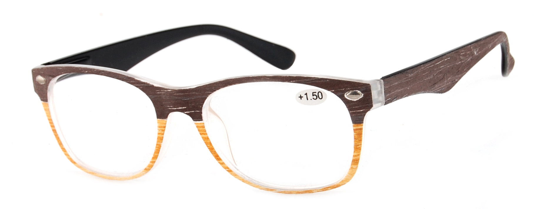 Modern full-frame style, internal spring hinge and matte clear with wood stick and temple in wood pattern.